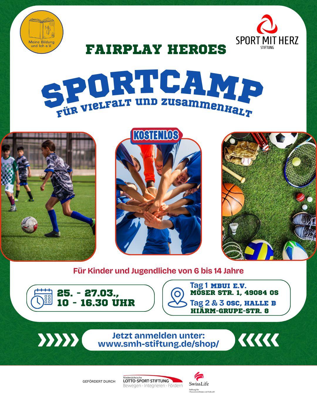 Du hast Lust auf Bewegung, Spiele und möchtest mitbestimmen? Du willst erleben, was Fairness, Teamgeist und Demokratie im Alltag bedeuten? Dann sichere dir jetzt deinen Platz im kostenlosen 3-tägigen Demokratie- und Sportcamp „Fairplay Heroes“ der Sport-mit-Herz-Stiftung in Kooperation mit Meine Bildung und Ich e.V.!